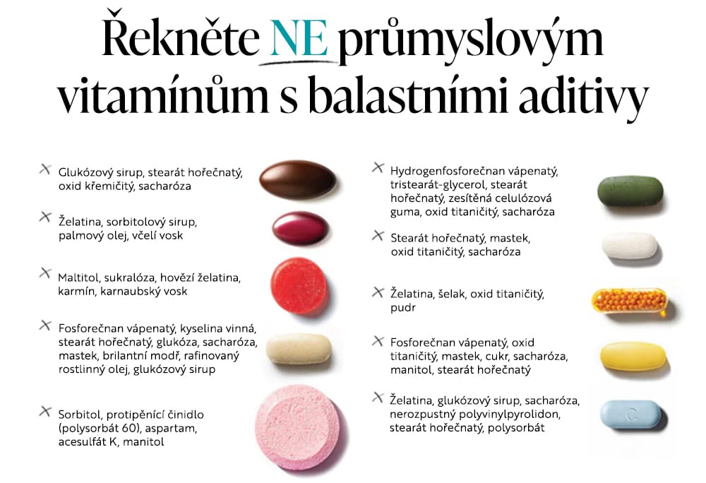 Doplňky výživy mohou vyplnit nutriční mezery v naší stravě a poskytnout podporu, mnoho vitamínů ale obsahuje vysoký podíl balastních aditiv (tzv. pomocných látek). Tyto přísady zahrnují plniva, pojiva, emulgátory, umělé příchutě, barviva, umělá sladidla a umělé konzervační látky. Jsou v produktech zahrnuty z komerčních důvodů, nikoli zdravotních. Tělo je nepotřebuje, proto se z našeho pohledu jedná o nadbytečný balast.